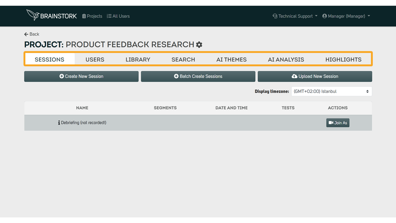 These are Sessions, Users, Library, Search, AI Themes, AI Analysis and Highlights Tabs. You can click on them to get more information.